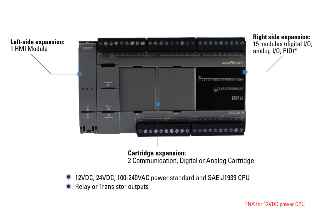 The MicroSmart PLC supports the CAN J1939 protocol, commonly used in diesel power train applications, in-vehicle networks for trucks & buses, agriculture & forestry machinery, military and recreational vehicles, and marine navigation systems.